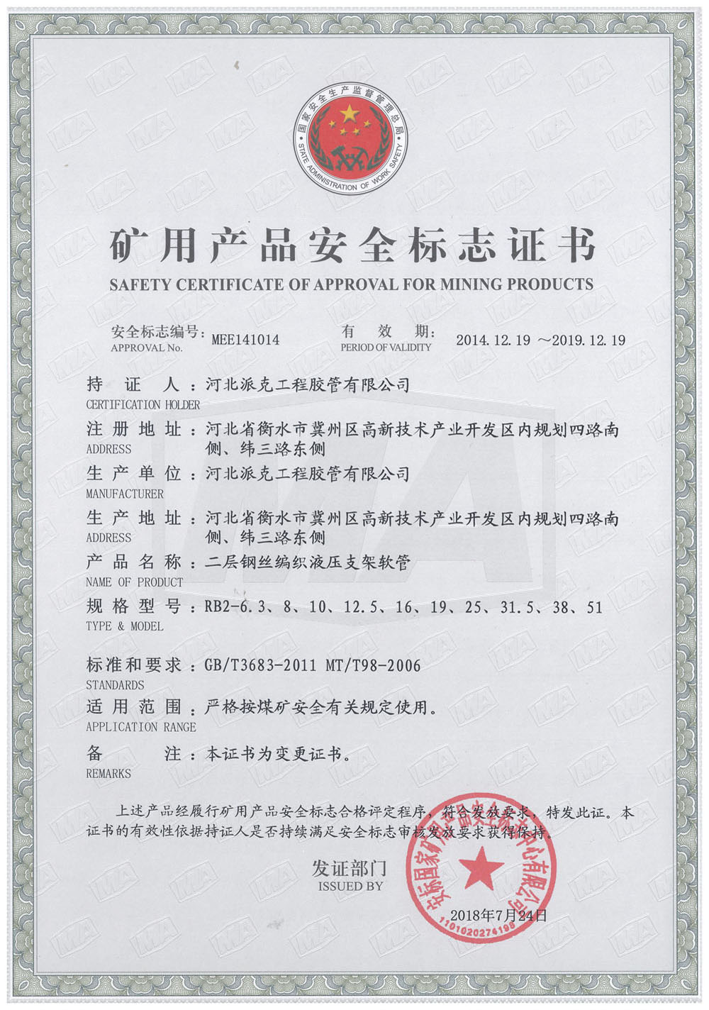 煤礦井下抽放瓦斯用橡膠連接軟管證書(shū)